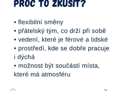 Nezáleží na tom, jestli jsi student, rodič na rodičovské dovolené nebo aktivní senior. Důležitá je chuť pracovat, spolehlivost a přátelský přístup k lidem. Zkušenosti nejsou podmínkou, vše potřebné tě rádi naučíme. Hledáme posily na obsluhu v hospůdce a bistrobusu, do kuchyně, na úklid, údržbu areálu i pomoc při akcích pro děti.