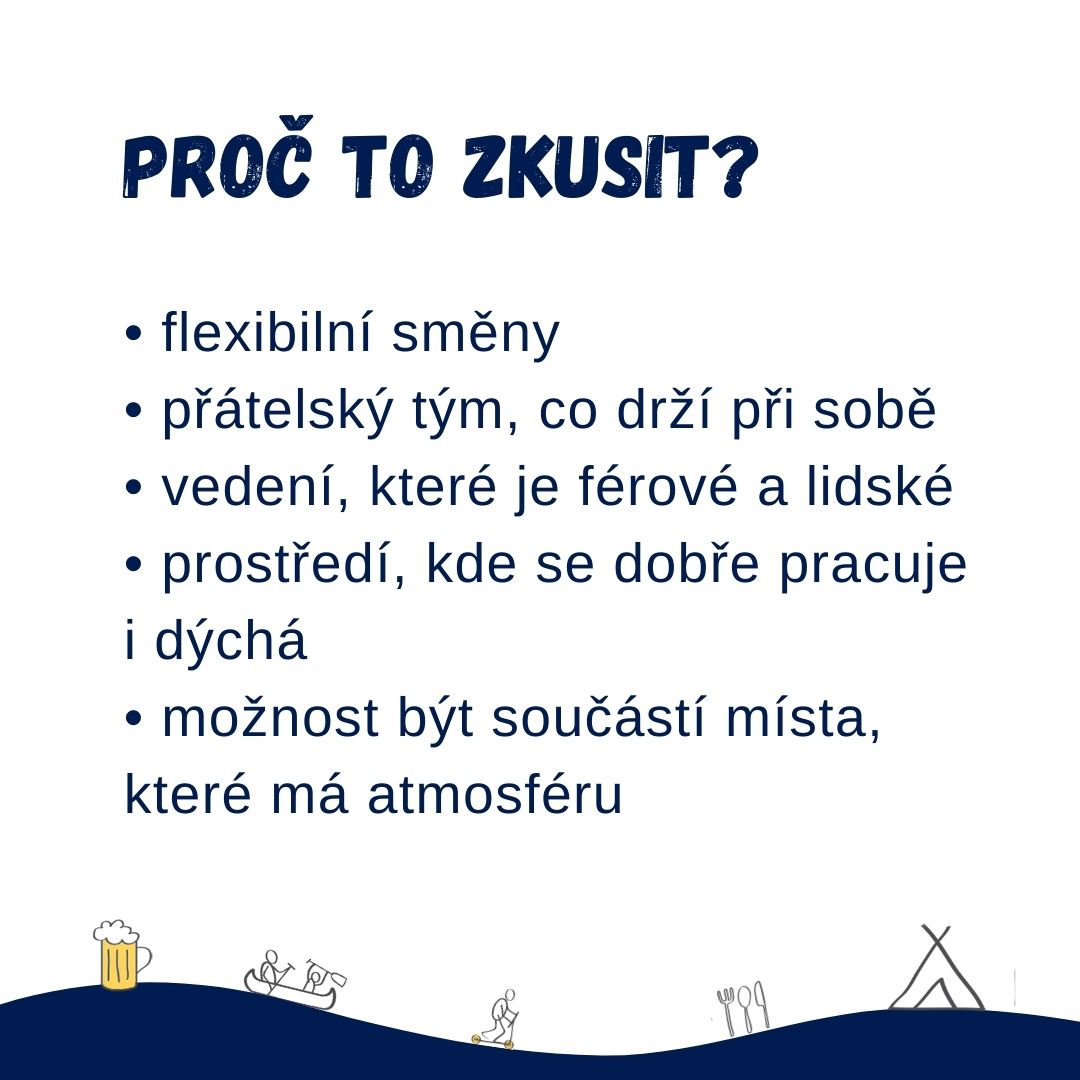 Nabízíme flexibilní směny, férové a lidské vedení a přátelský tým. Pracovat budeš v prostředí u řeky, kde se dobře pracuje i dýchá, a budeš součástí místa, kam se lidé rádi vracejí.