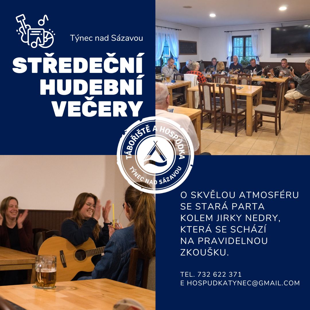 🎶 Živá hudba – užijte si večery s folk a country kapelami Čtyři z Týnce, River Grass nebo Sešlostí. Přijďte posedět, zazpívat si a nasát pohodovou atmosféru.