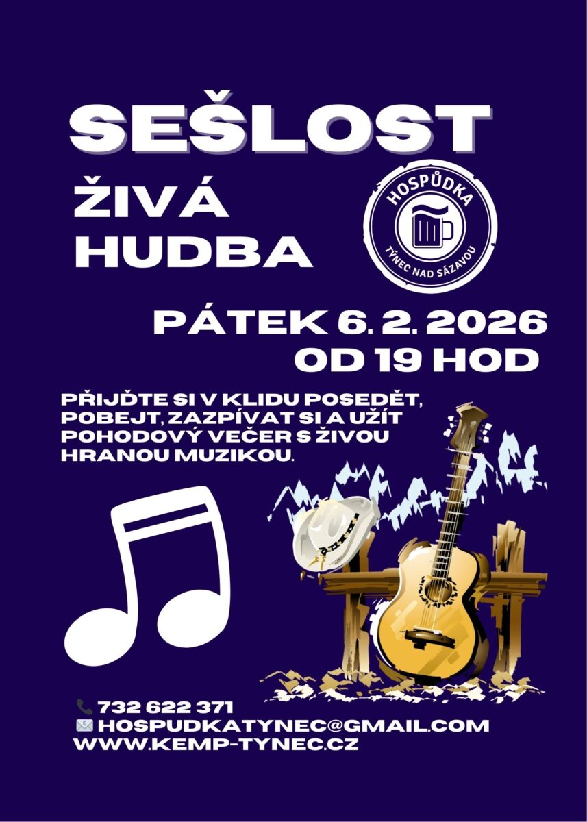 Zveme vás na pohodový večer se živou hranou muzikou. Přijďte si v klidu posedět, pobejt, zazpívat si a užít přátelskou atmosféru u dobrého pití. Sešlost je o setkávání, muzice a společně stráveném čase – bez spěchu a bez velkých pódií.