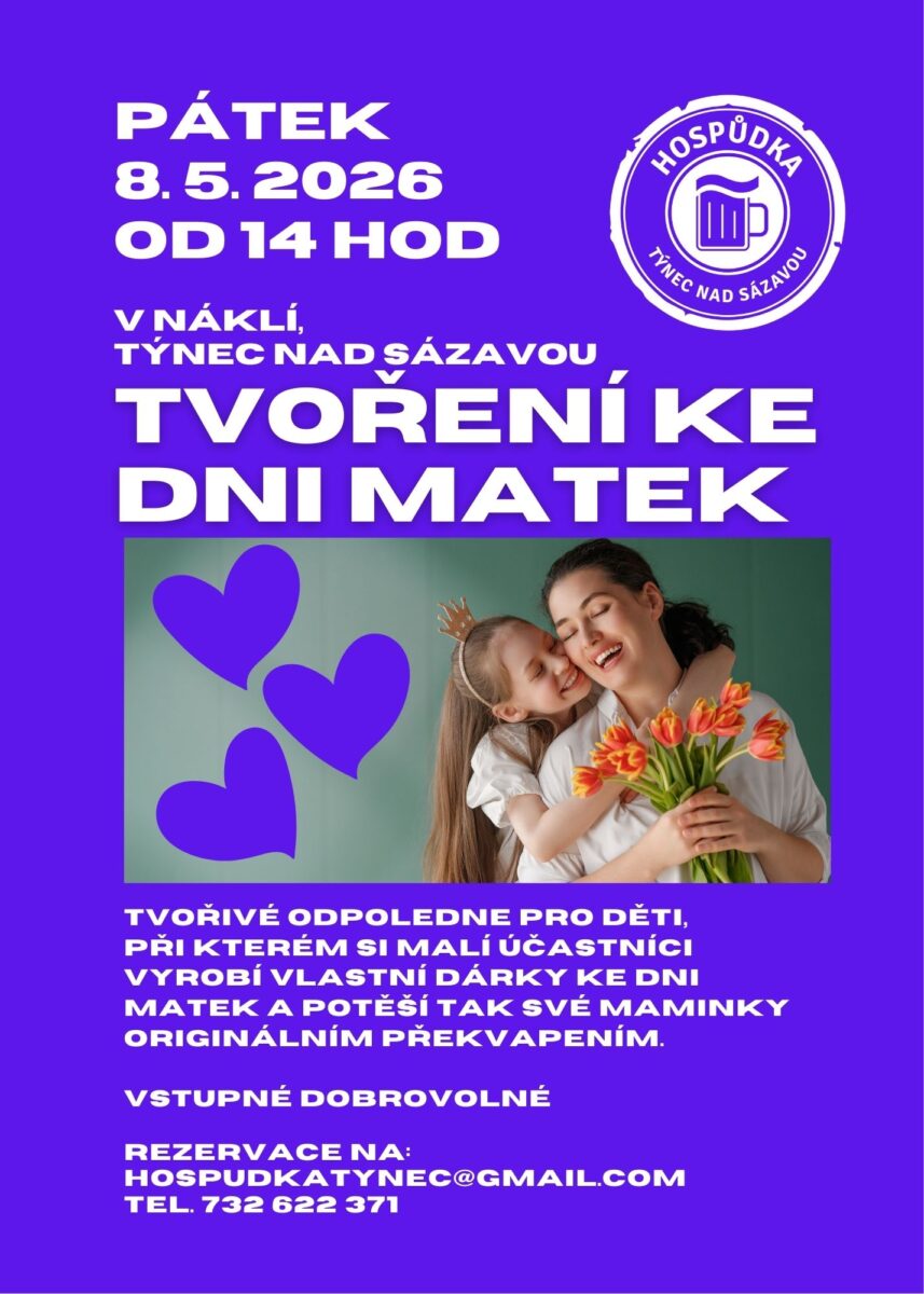 Tvořivé odpoledne pro děti, při kterém si malí účastníci vyrobí vlastní dárky ke Dni matek a potěší tak své maminky originálním překvapením. Akce je určena dětem, vstupné je dobrovolné.